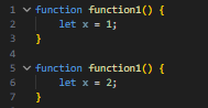 The x variable in this photo is declared twice with same name but because its declared inside of functions which makes it local function it cant be used outside of function which means that it does not make any problems and js does not throw any errors.